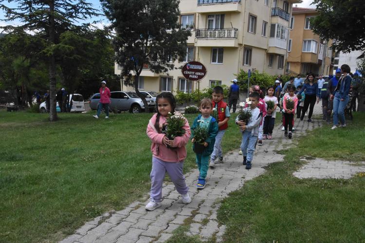 Ellerinde papatyalarla dolaşan çocuklar daha sonra belediye ekipleriyle birlikte papatyaları parkın çeşitli yerlerine ekti.