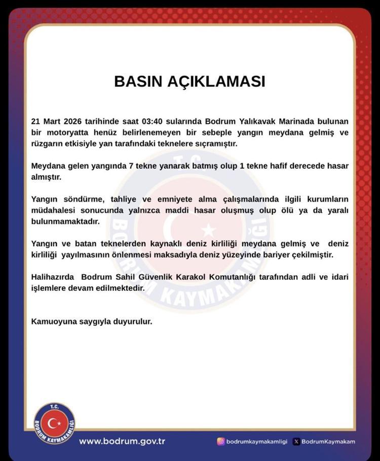 "21 Mart 2026 tarihinde saat 03.40 sıralarında Bodrum Yalıkavak Marinada bulunan bir motoryatta henüz belirlenemeyen bir sebeple yangın meydana gelmiş ve rüzgarın etkisiyle yan tarafındaki teknelere sıçramıştır. Meydana gelen yangında 7 tekne yanarak batmış olup 1 tekne hafif derecede hasar almıştır. Yangın söndürme, tahliye ve emniyete alma çalışmalarında ilgili kurumların müdahalesi sonucunda yalnızca maddi hasar oluşmuş olup ölü ya da yaralı bulunmamaktadır. Yangın ve batan teknelerden kaynaklı deniz kirliliği meydana gelmiş ve deniz kirliliği yayılmasının önlenmesi maksadıyla deniz yüzeyinde bariyer çekilmiştir. Halihazırda Bodrum Sahil Güvenlik Karakol Komutanlığı tarafından adli ve idari işlemlere devam edilmektedir."