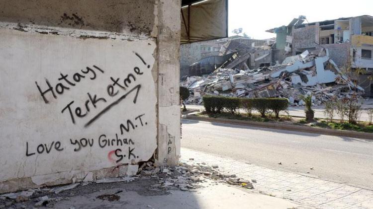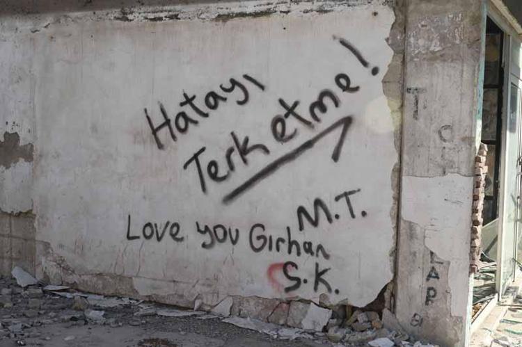 Tüm olumsuzluklara rağmen bazı kişiler, ağır hasar almayan ve gözle görülen noktalardaki duvarlara yazdıkları yazılarla moral vermeye çalışıyor. Sprey boyayla duvarlara yazılan 'Hatay'ı terk etme', 'Geri döneceğiz Hatay', 'Her şey güzel olacak, gitmedik, buradayız', 'Seninleyiz Hatay' gibi yazılar, umut ışığı oldu. 4 katlı olduğu öğrenilen ve depremde yıkılan binanın altına yazılan 'Yıkılma Hatay biz varız', 'Akseki Güzelsu yanında İskenderun' yazısı ise duygulandırdı.