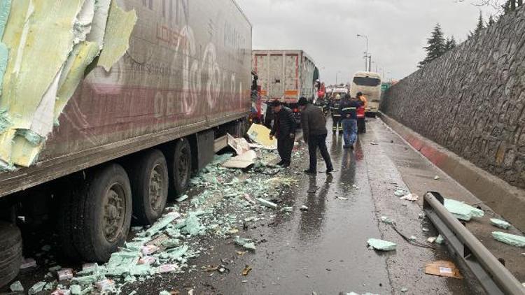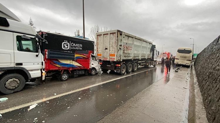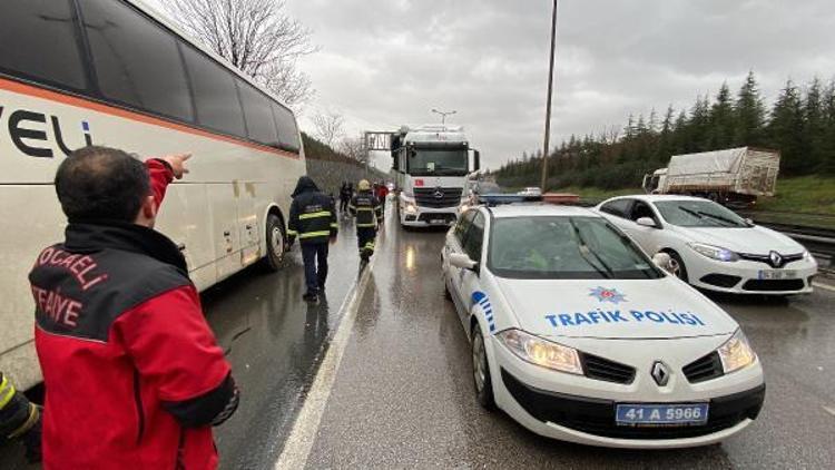 İzmit'te, TEM Otoyolu'nda, 1 otobüs, 2 TIR ve 1 kamyonetin karıştığı zincirleme kazada 4 kişi yaralandı. Kaza nedeniyle İstanbul istikametinde uzun araç kuyrukları oluştu.