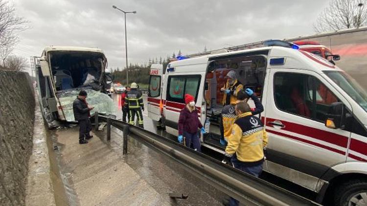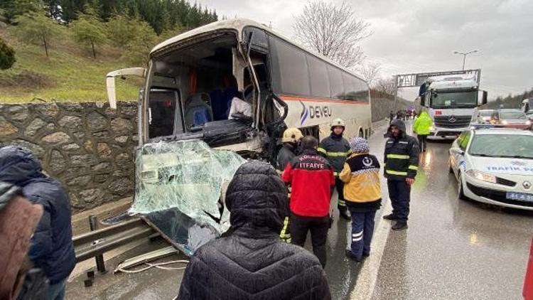 Aniden yavaşlayan trafik nedeniyle sürücüsünün direksiyon kontrolünü kaybettiği otobüs, önünde duran TIR'a çarptı.