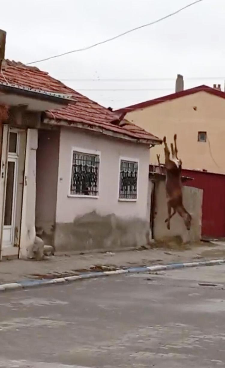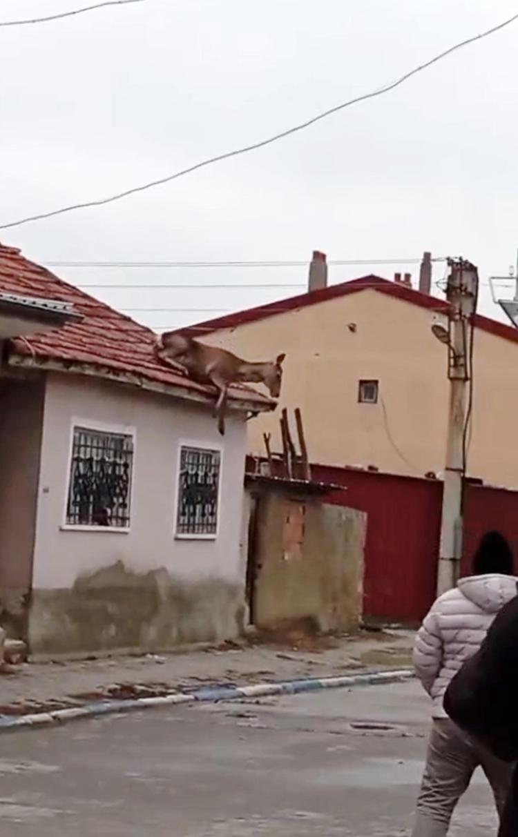 Afyonkarahisar'ın Sultandağı ilçesinde köpeklerden korkup, tek katlı evin çatısına çıkan kızıl geyik, aşağı inerken 3 metreden düşüp, öldü. Geyiğin düşme anı cep telefonuyla görüntülendi.
