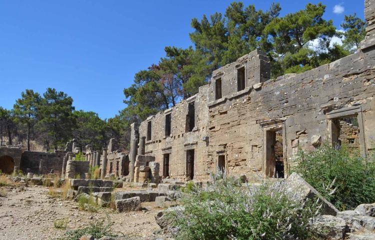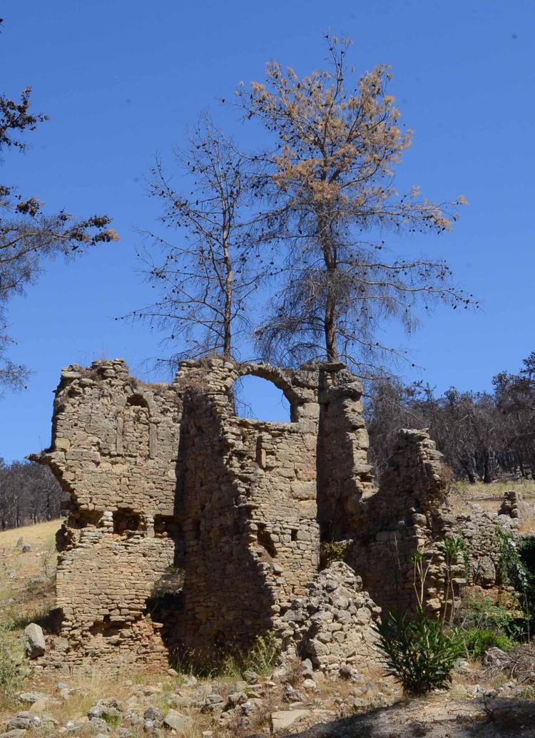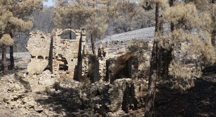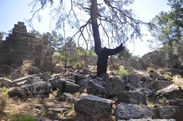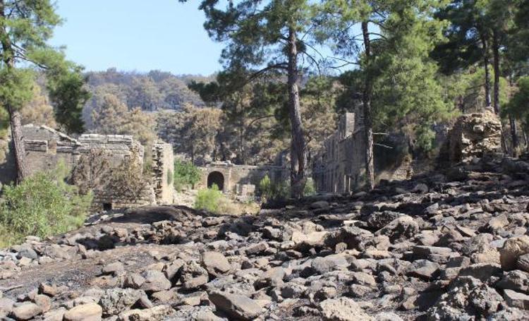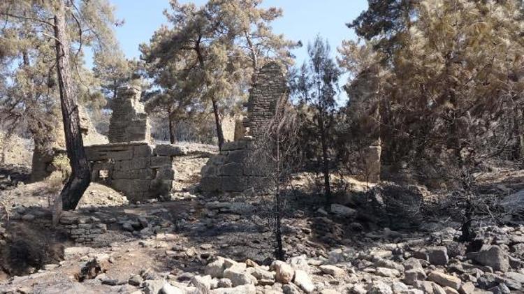 Tarihi antik kentin içindeki hamam, sarnıç, agora ve tapınak ise alevler nedeniyle tamamen siyaha büründü. Kent içinde yer alan ve çevresi tel ile kapatılan sarnıcın olduğu alan da zarar gördü.