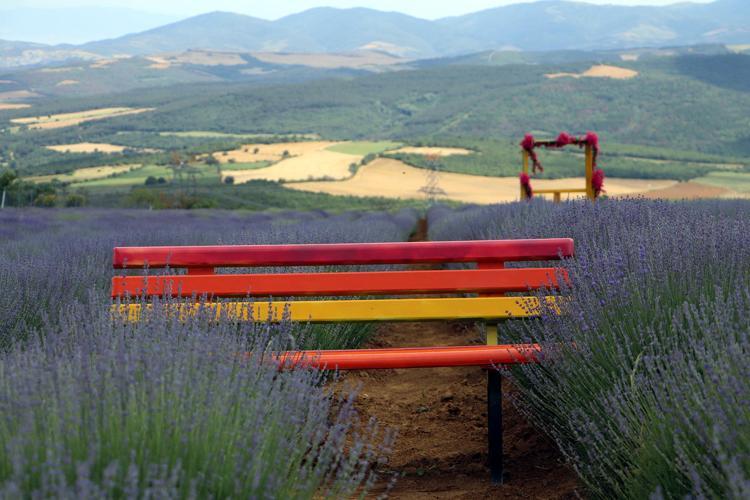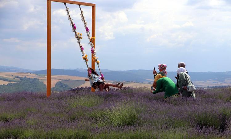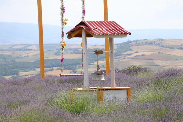 Lavanta tarlalarına kurulan dekorlarla ziyaretçiler fotoğraflar çektiriyor.