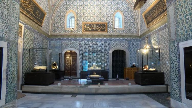 Ramazan ayına sayılı günler kala Topkapı Sarayı Mukaddes Emanetler Dairesi’nde yaklaşık 600 eser ziyaretçilerini bekliyor. Milli Saraylar Başkanı Dr. Yasin Yıldız, "Her türlü iklim şartına her türlü doğal afete karşı burada yapılmış sergi düzeni ciddi bir müzecilik başarısını içinde barındırıyor. Bir de geçtiğimiz yıl Cumhurbaşkanımızın teşrifiyle açıldıktan sonra burada sergilenen eser sayısı 60’dan 300’e yükseltildi. Bu çok önemli çünkü koleksiyonumuzda bulunan bu yeni sergileme düzeniyle birlikte her eseri ziyaretçimizle buluşturmuş olduk" dedi. Kutsal Emanetler Dairesi'ndeki eserler Salı günü hariç hergün 09.00-17.00 saatleri arasında ziyaret edilebilecek.