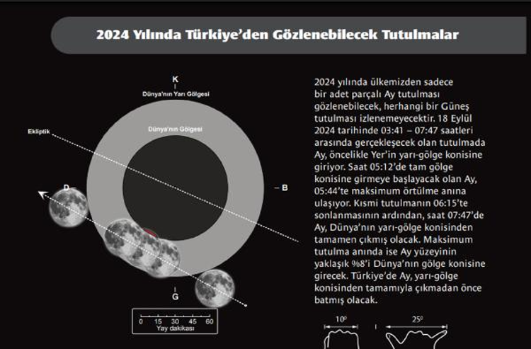 2024 yılında Türkiye’den sadece parçalı ay tutulması gözlenebilecek, herhangi bir Güneş tutulması izlenemeyecek. 18 Eylül 2024 tarihinde 03.41 ile 07.47 saatleri arasında gerçekleşecek tutulmada Ay, öncelikle yerin yarı gölge konisine giriyor. Saat 05.12'de tam gölge konisine girmeye başlayacak olan Ay, 05.44'te maksimum örtülme anına ulaşıyor. Kısmi tutulmanın 06.15'te sonlanmasının ardından, saat 07.47'de Ay, Dünya'nın yarı gölge konisinden tamamen çıkmış olacak. Maksimum tutulma anında ise Ay yüzeyinin yaklaşık yüzde 8'i dünyanın gölge konisine girecek. Türkiye'de Ay, yarı gölge konisinden tamamıyla çıkmadan önce batmış olacak.