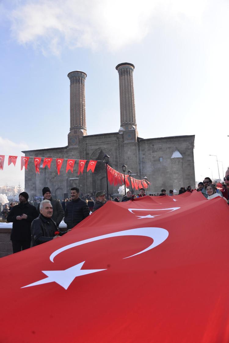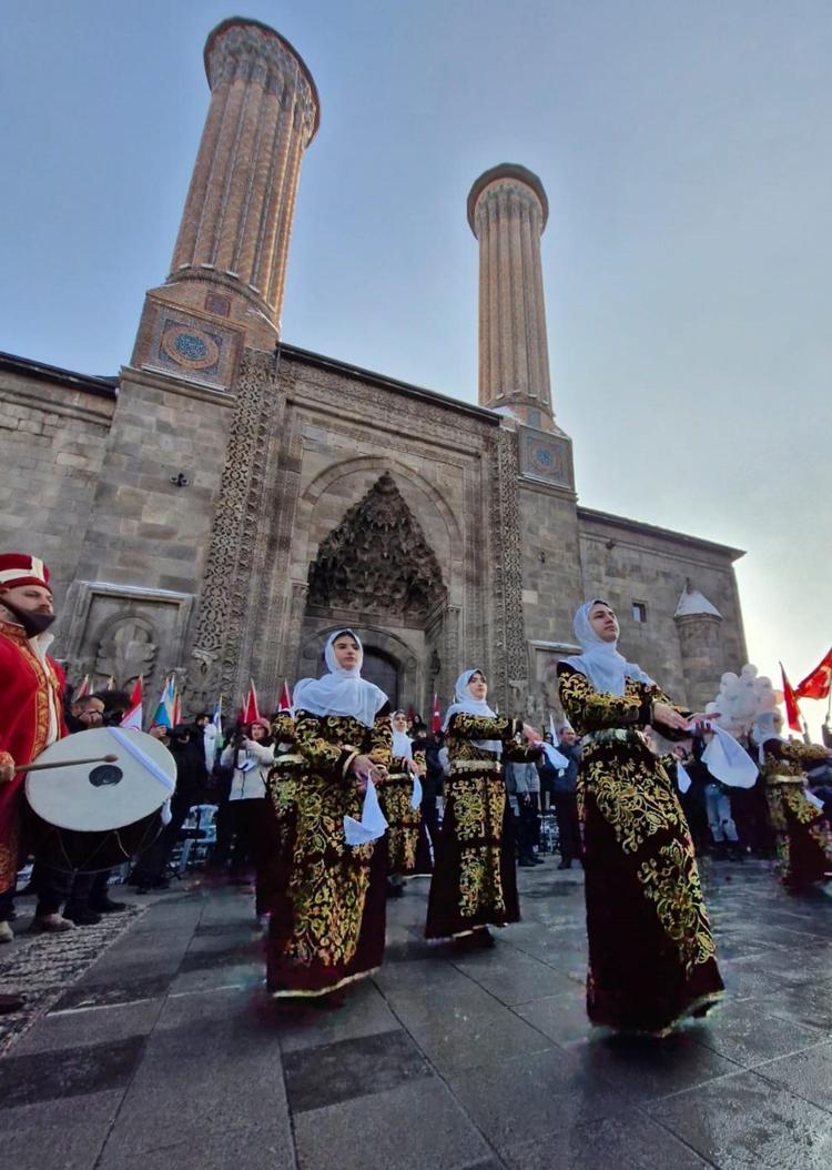 Erzurum Büyükşehir Belediyesi Mehter Takımı’nın yanı sıra, 100 metre uzunluğunda bayrağın da yer aldığı yürüyüşün ardından Çifte Minareli Medrese önünde tören düzenlendi. Halk oyunları gösterisiyle başlayan törende konuşan 2025 Turizm Başkenti Koordinasyon ve Kültür Başkenti Koordinatörü Muharrem Çığlık, Erzurum'un altyapı ve üstyapısıyla başkent unvanını hak ettiğini söyledi.
