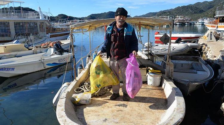 Antalya'nın doğa harikası Kekova yarımadasında yaşayan Cevdet Eren (62), 30 yıldır Kaleköy, Akvaryum, Hamidiye, Tersane gibi doğa harikası koylara tur tekneleri ve özel yatlarıyla gelenlerin bıraktığı çöpleri topluyor. Pancar motorlu küçük teknesiyle saat 04.00'te temizliğe başlayan Eren'in yazın topladığı çöpün miktarı, günde 3 tona kadar çıkıyor.