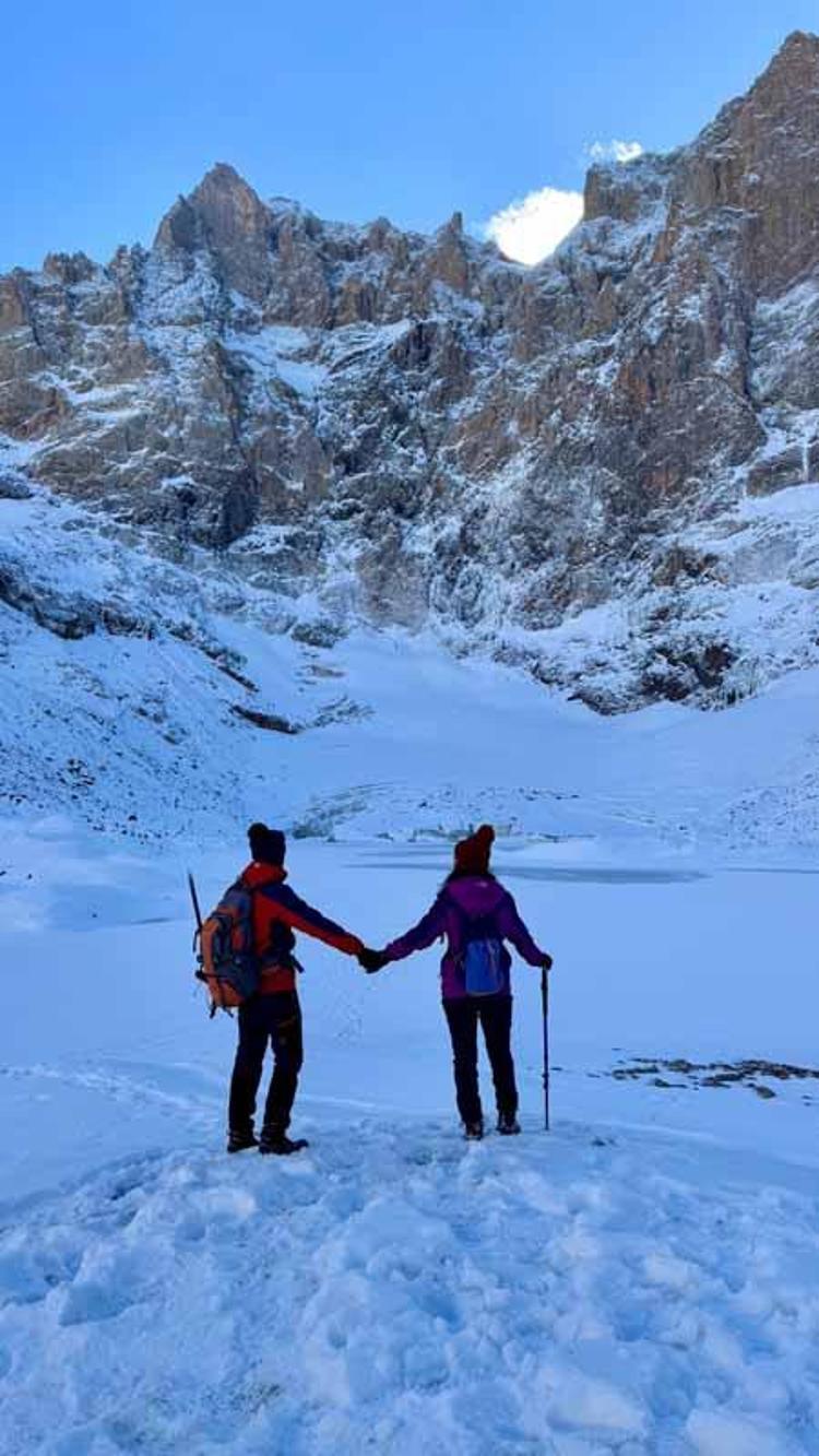 Doğaseverler, buz tutan buzul gölünde yürüyüş yapıp, buzul tabakaları önünde hatıra fotoğraf çekti.