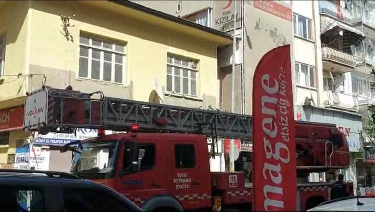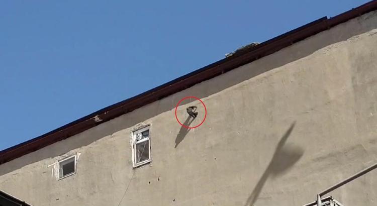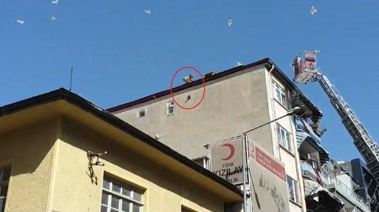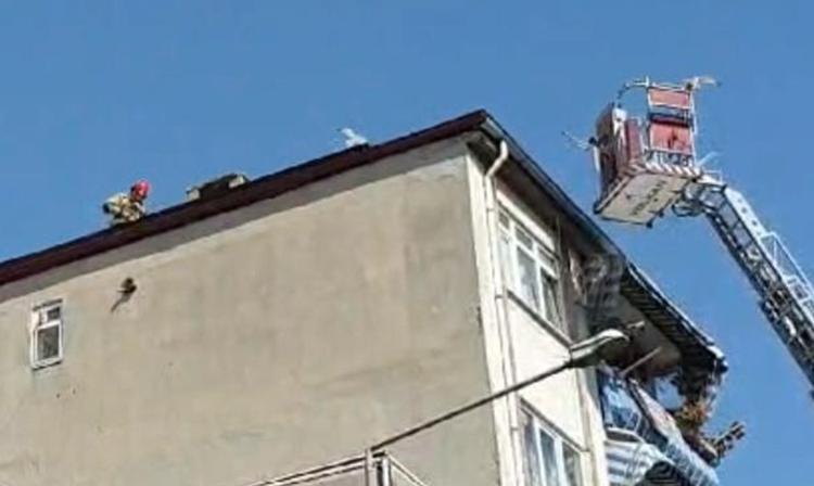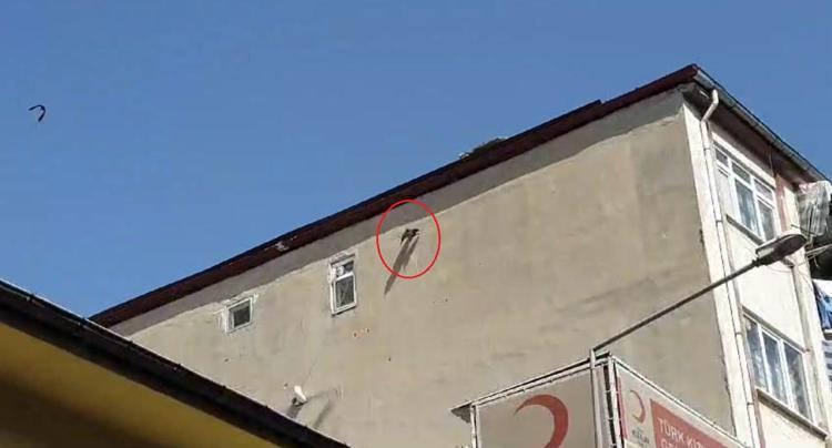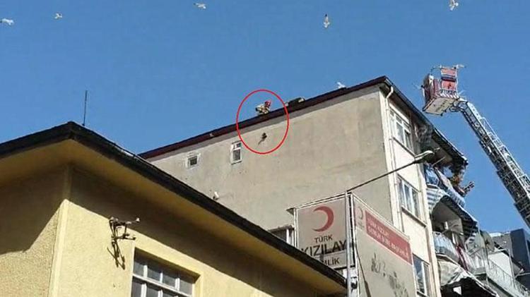 4 katlı binanın çatısından sarkan ipe dolanan kargayı itfaiye kurtardı