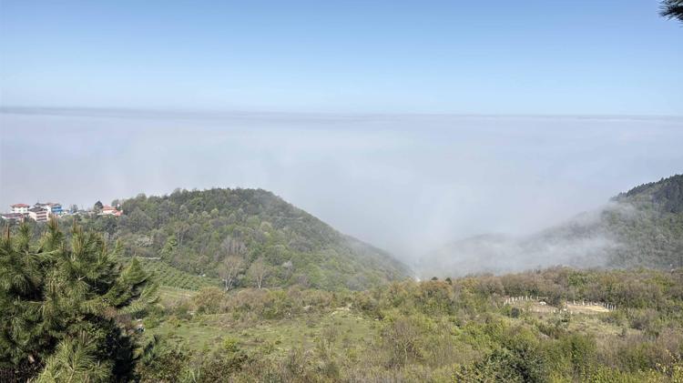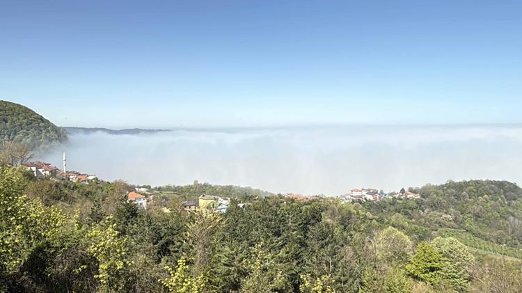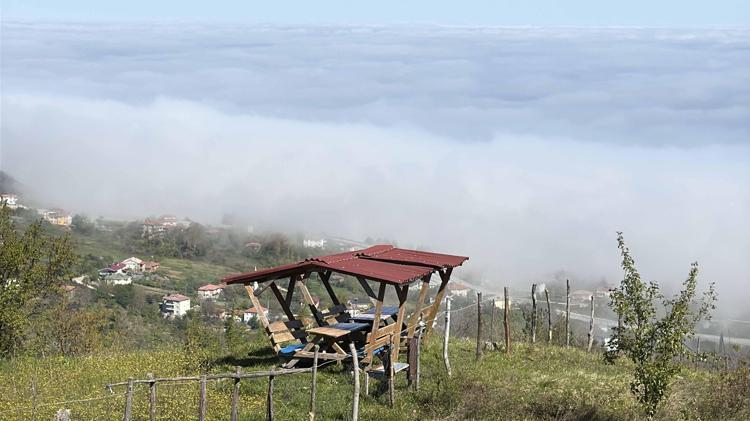 Denizden karaya doğru uzanan sis nedeniyle eşsiz manzara oluşurken, ilçeye gelen turistler Amasra'yı tepeden gören Ahatlar köyü Bakacak mevkisinde bol bol fotoğraf çekti.