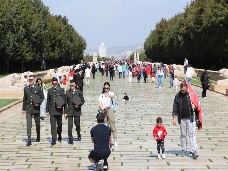 Askerlerin nöbet değişimi sırasında yaptıkları seremoniyi ilgiyle izleyen ziyaretçiler, tören meydanında hatıra fotoğrafı çektirdi. Anıtkabir, 23 Nisan nedeniyle saat 21.00'e kadar ziyarete açık olacak.