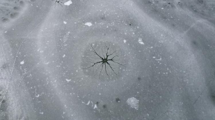 Sivas'ın Hafik ilçesindeki Pusat-Özen Baraj Gölü’nün yüzeyi, soğuk havanın etkisiyle buzla kaplandı. Su seviyesinin azalmasıyla eski Pusat köyü kalıntılarının yeniden ortaya çıktığı baraj gölünde, buz tutan yüzey üzerinde çok sayıda çatlak oluştu. İlgi çeken görüntüler, havadan dron kamerasına yansıdı.