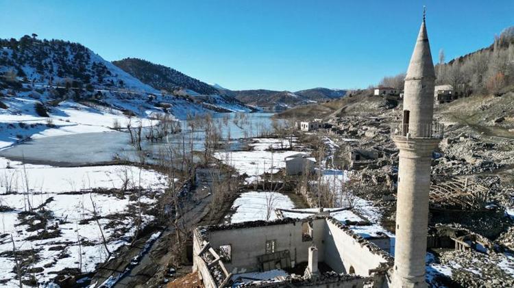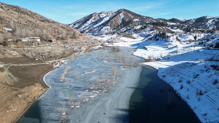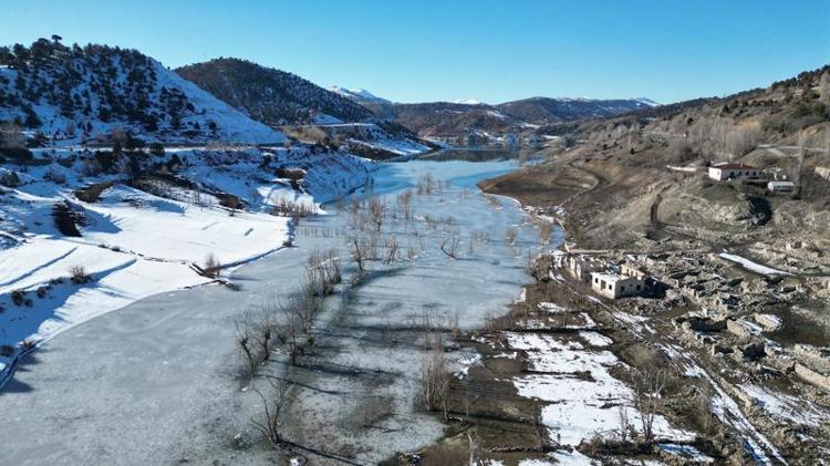 Su seviyesinin bir hayli azaldığı baraj gölünün yüzeyi, son günlerde soğuk havanın etkisiyle buz tuttu. Özellikle eski köy yerleşim yerinin bulunduğu alana yakın noktada gölün buz tutan kısımlarında çatlaklar oluştu. Çatlaklar halindeki şekiller, havadan dron ile görüntülendi.