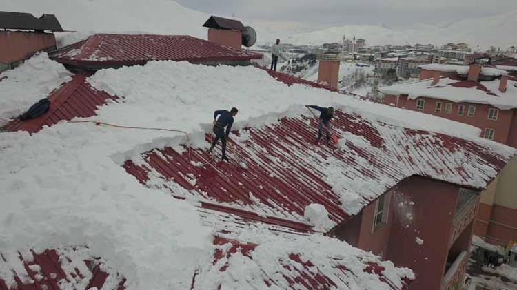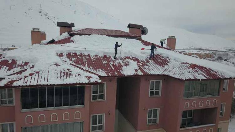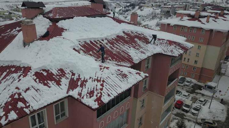 Çatıda 2 kişi kürekle karları temizlerken, diğeri bir noktaya bağlanan ipi tutarak güvenliklerini sağlamaya çalışıyor.