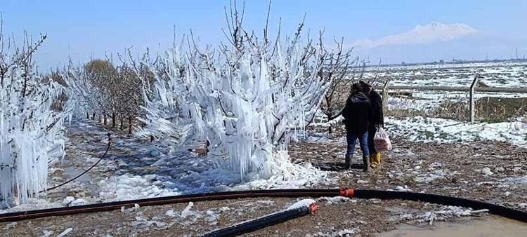 Kayseri'nin Yahyalı ilçesindeki elma üreticileri, ürünlerini zirai dona karşı ağaçların üzerinde oluşturulan buz tabakasıyla 'Spring' yöntemi korumaya çalışıyor.