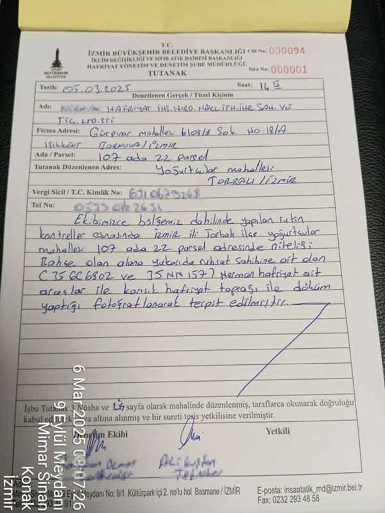 İzmir Büyükşehir Belediyesi İklim Değişikliği ve Sıfır Atık Dairesi Başkanlığı'na bağlı Kent Temizliği Şube Müdürlüğü denetim ekipleri, Gaziemir ilçesi Emrez Mahallesi'ndeki eski kurşun fabrikası atıklarının Torbalı ilçesi Yoğurtçular Mahallesi'ndeki boş bir alana izinsiz şekilde döküldüğünü belgeledi. Emrez Mahallesi 49 ada 12 parselde, bir geri dönüşüm, atık depolama ve inşaat şirketinin kazı yaptığı belirlenerek tutanak tutuldu. Ekipler, sahada döküm yapan şirketi takibe aldı. Eski kurşun fabrikasına ait bölgedeki toprağın iş makineleri ile bir hafriyat şirketine ait 35 GC 6802 ve 35 NN 157 plakalı kamyonlara yüklendiği belirlendi.