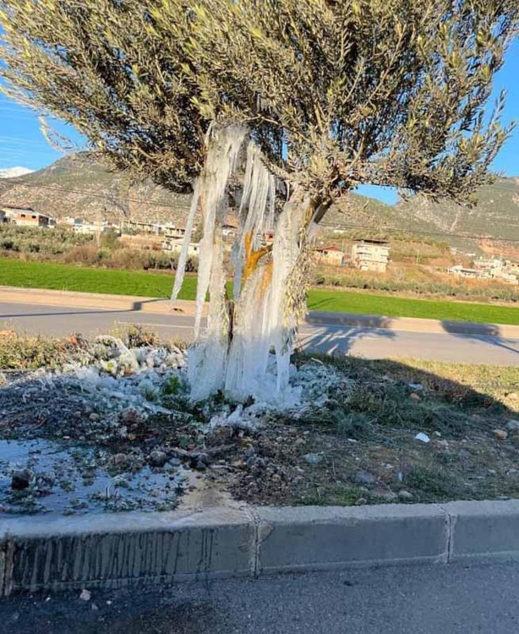 Gaziantep’in İslahiye ilçesinde, hava sıcaklığı gece eksi 10 dereceye kadar düşünce Gürgür Şelalesi buz tuttu, zeytin ağaçlarında buz sarkıtları oluştu.
