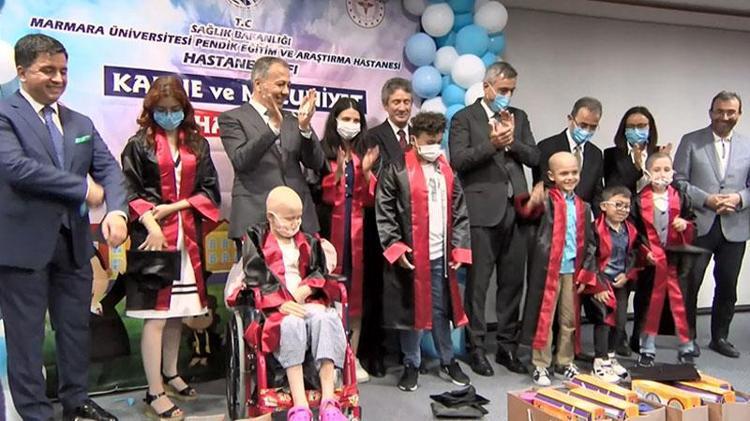Marmara Üniversitesi Pendik Eğitim Araştırma Hastanesi Başhekimi Prof. Dr. Hakan Gündüz "Hastanemizde bulunan hastane sınıfındaki öğrencilerimizin karne törenini yaptık. Türkiye'de ilk kez bir hastane sınıfının mezuniyet törenini yaptık. İlkokul, ortaokul ve lisede tam 31 tane öğrencimiz eğitim görmekte.