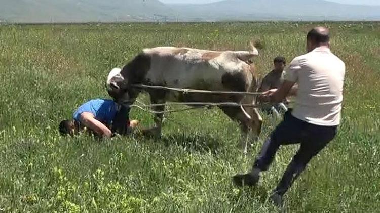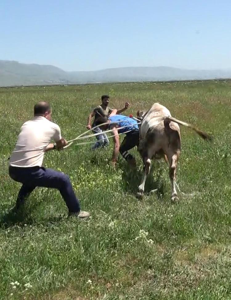 Kaçan boğaya uyuşturucu iğne atıp kementle yakaladılar, sahibi boynuz darbelerinden son anda kurtuldu