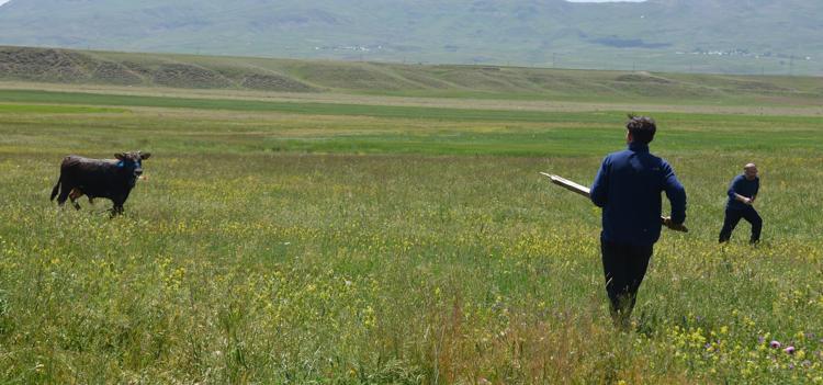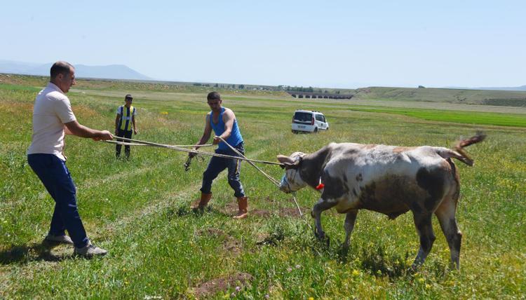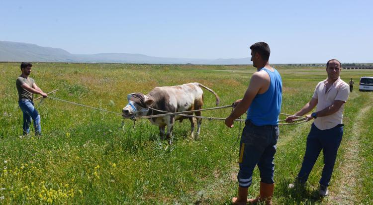 Erzurum’un Uzunahmet Mahallesi'nde sahiplerinden kaçan boğa ve inekler sahiplerine zor anlar yaşattı. Pasinler Ovası'na kaçan kurbanlıkları yakalayamayan vatandaşlar Erzurum Büyükşehir Belediyesi'nin kurban yakalama timinden yardım istedi.