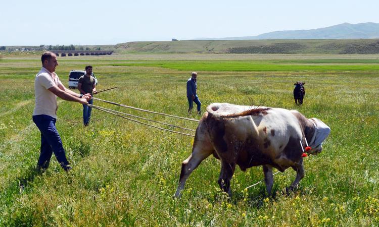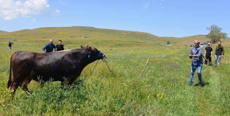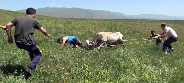 O saatten beri dağda bayırda peşinden koşturuyoruz. En sonunda dereye sıkıştırdık, boynuna kement attık. Kardeşim kazağını çıkarıp gözünü kapattı. Yolda gelirken önce beni düşürdü, boynuzuyla kolumu morarttı. Biraz ilerledikten sonra kardeşimi de önüne katıp sürdü vurarak. Belediyeye telefon açtık. Kurban yakalama timi geldi yardım etti. 3 tane iğne vurdu. Bir tane de fayda etmedi. O şekilde hayvanı sakinleştirdik" dedi.