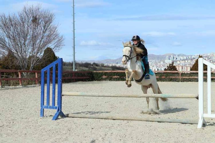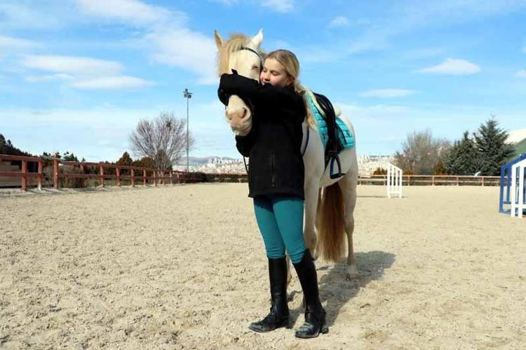 Ankara Binicilik İhtisas Kulübü'nde 7 yaşında biniciliğe başlayan Zehra Aden Çelebi (10), 1 yıldır bindiği gözleri ışığa duyarlı olduğu için engelleri görmede sorun yaşayan 'pony' cinsi atı 'Ragnar' ile 4 ayda katıldığı yarışlarda 7 kupa kazandı. Albino atı Ragnar gibi saçları sarı, gözleri mavi olan Zehra Aden Çelebi, "Bence albino olması nedeniyle birbirimize çok benziyoruz. Aramızda bu nedenle bir bağ oluştu ve engelleri birlikte aşıyoruz" dedi.