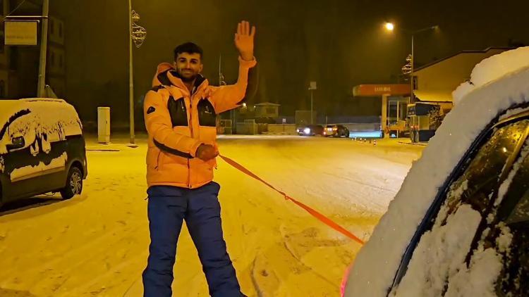Gece saatlerinde ilçe merkezinde arkadaşının otomobiline bağlanan ipi tutan Halil Kömür, trafiği tehlikeye düşürmeyecek şekilde snowboard yaptı. Hava sıcaklığının sıfırın altında 19 derece olduğu gecede Kömür'e zaman zaman sokak köpekleri de geldi.