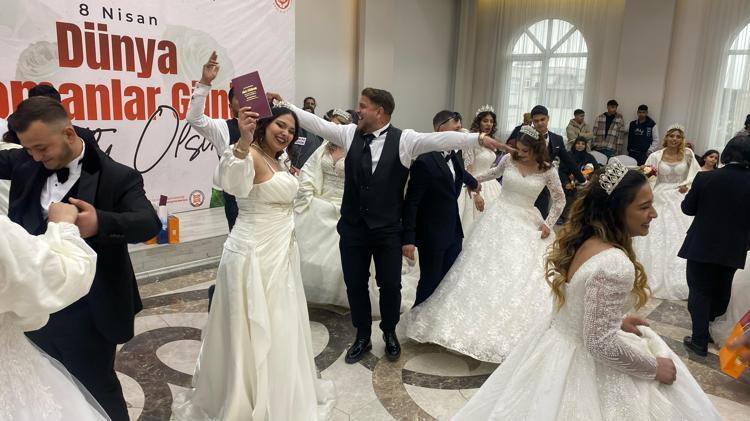 Samsun’da yıllar önce nikahsız birlikte yaşamaya başlayan 15 Roman çift, ‘8 Nisan Dünya Romanlar Günü’ dolayısıyla düzenlenen toplu törenle nikah masasına oturdu. Törene bazı çiftler çocuklarıyla birlikte katılırken, bir çift ise 2 aylık bebekleriyle dünya evine girdi.
