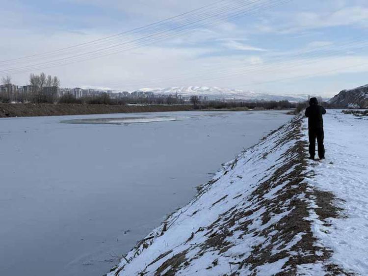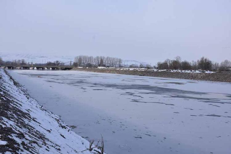 Soğuk havanın etkisi ile nehirde su akışının zayıf olduğu bölümlerin yüzeyi buz tuttu.