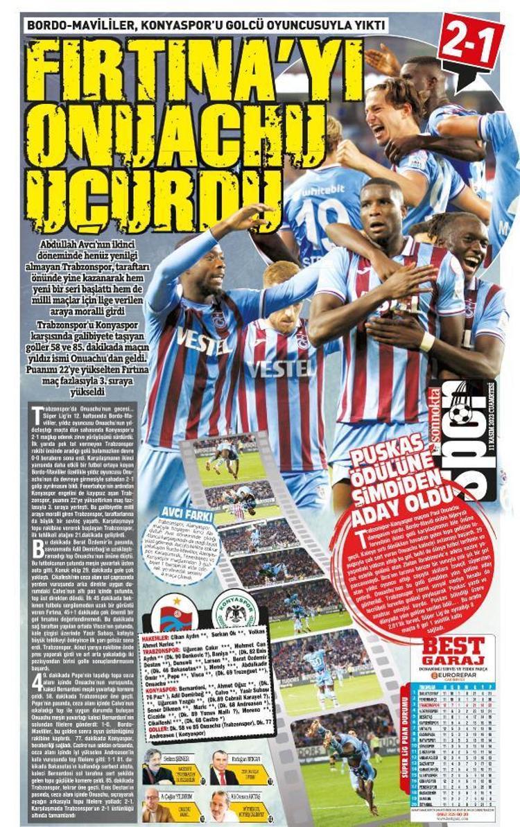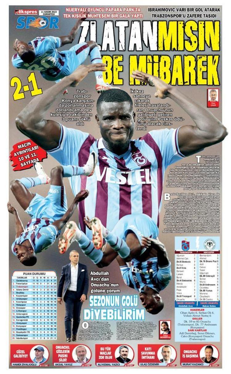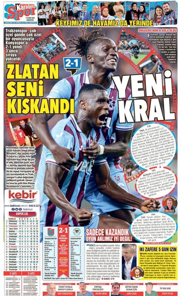 Öte yandan kentteki yerel gazeteler, Konyaspor galibiyetini ve maçın adamı Onuachu’yu sayfalarına taşıdı. Kuzey Ekspres gazetesi ‘Zlatan mısın be mübarek’, Karadeniz gazetesi ‘Zlatan seni kıskandı, yeni kral’, Sonnokta gazetesi, ‘Fırtına’yı Onuachu uçurdu’ ‘Puskas ödülüne şimdiden aday oldu’, Taka gazetesi ‘Onuachu atıyor fırtına kopuyor’, Günebakış gazetesi 'Onuachu şov, Avcı ile havaya giren Trabzon zirveye yürüyor' başlıklarına yer verdi. (DHA)