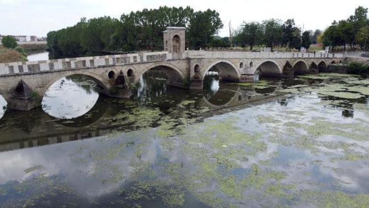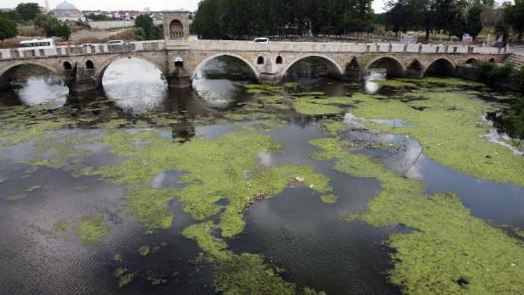 Tunca Nehri'nde su seviyesi yarıya düştü; yüzeyi ot ve çöple kaplandı