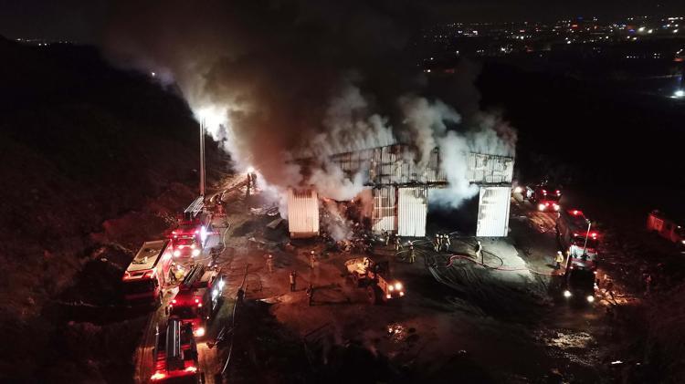 Yanan geri dönüşüm tesisi havadan da görüntülendi.