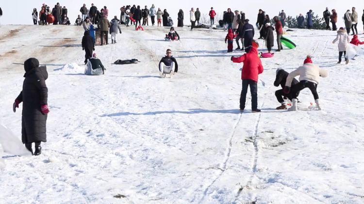 Vatandaşlar ellerindeki şişme botlarla, tepsilerle, leğenlerle, poşetlerle, tahtadan yaptıkları kızaklarla kayarak karın keyfini çıkardı.