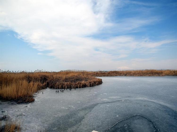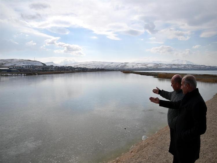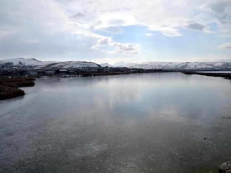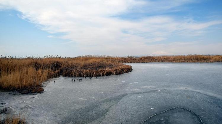 Van Gölü’nün tatlı su kaynaklarına yakın ve derinliğin az olduğu sazlık bölgeler, etkili olan soğuk hava nedeniyle dondu.