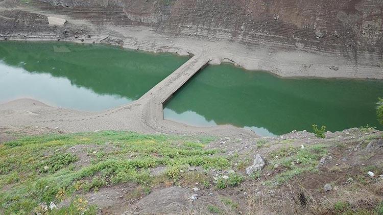 Azalan su seviyesiyle köyleri birbirine bağlayan ve barajın yapılmasıyla sular altında kalan köprülerden biri gün yüzüne çıktı.