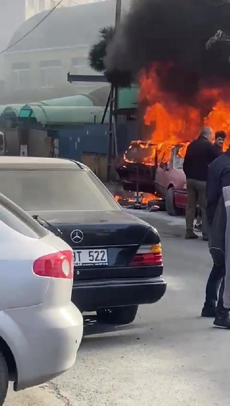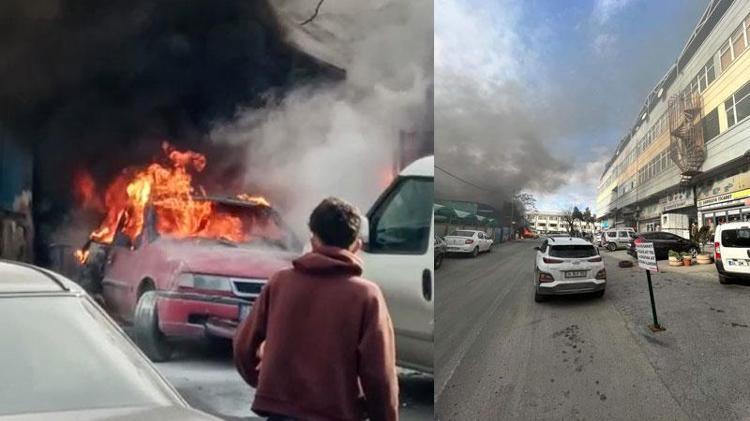 Tamire bırakılan otomobil alev alev yandı.