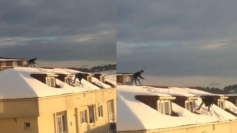 Kar yağışının ardından İstanbul'da binaların çatılarında temizlik çalışması yapanlar tehlikeli anların ortaya çıkmasına sebep oluyor. Kar yağışının en yoğun yaşandığı ilçelerden biri olan Arnavutköy'de vatandaşların hiçbir güvenlik önemli almadan bina çatılarında kar temizliği yapması görenleri şaşkına çevirdi. Arnavutköy Merkez Mahallesi'nde 5 katlı binanın çatısını temizleyen 2 kişiyi görenler o anları cep telefonu kamerasıyla görüntülendi. Çatının ön bölümüne kadar gelen kişinin beline bağladığı ipi arkada bulunan kişi tutarak önlem alması dikkat çekti.
