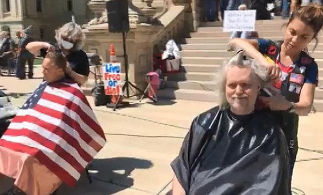 ABD’de göstericiler, koronavirüs (Covid-19) kısıtlamaları kapsamında berberlerin kapalı olmasını Michigan eyaletinde valilik binası önünde saç keserek protesto etti.