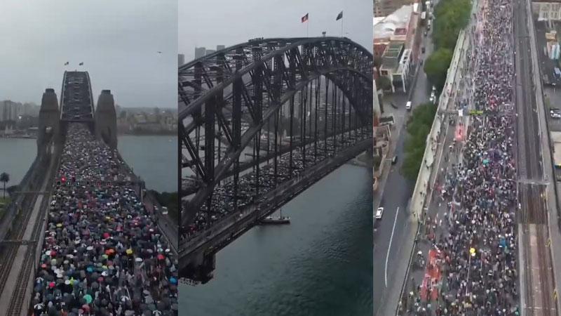 Avustralya’nın New South Wales eyaletinin Sydney kentinde Filistin'i destekleyenler, Sydney Liman Köprüsü'nde toplandı. Aralarında WikiLeaks internet sitesinin kurucusu Julian Assange, eski dışişleri bakanı Bob Carr ve milletvekili Ed Husic’in de bulunduğu en az 100 bin kişi Gazze için yürüdü.