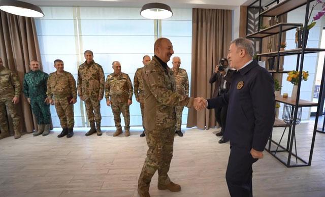 Milli Savunma Bakanı Hulusi Akar, 8 Kasım Zafer Günü kutlamalarına katılmak üzere geldiği Azerbaycan’da TSK komuta kademesiyle birlikte Cumhurbaşkanı İlham Aliyev tarafından kabul edildi.