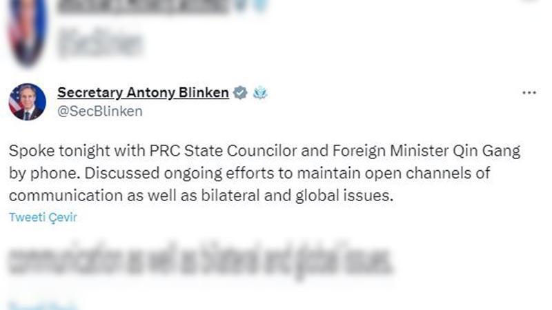 ABD Dışişleri Bakanı Blinken telefon görüşmesine dair sosyal medya hesabından yaptığı açıklamada, Çinli mevkidaşı Gang ile telefonda görüştüğünü belirterek, “İkili ve küresel konuların yanı sıra açık iletişim kanallarını korumaya yönelik devam eden çabaları ele aldık” ifadelerini kullandı.