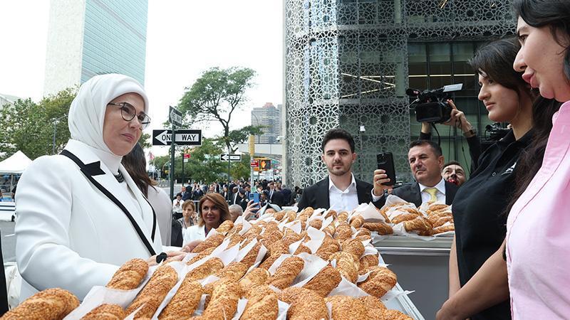 Stanttan bir tane simit alan Emine Erdoğan, simidin ABD'de yaygın olarak tüketilen ‘bagel’e rakip olduğunu ifade etti.