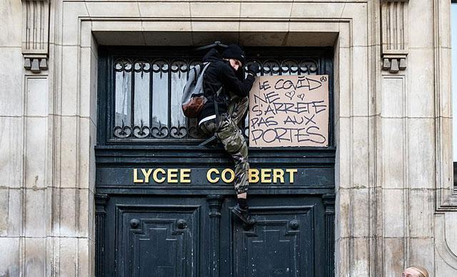 Liseli protestocular, Paris'in merkezindeki Lycee Koleji'nin girişine erişimi engellemek için çöp konteyner ve alışveriş arabalarını kullandı. Göstereciler, kolejin zemin katındaki penceresine "grevde" yazan bir pankart astı.