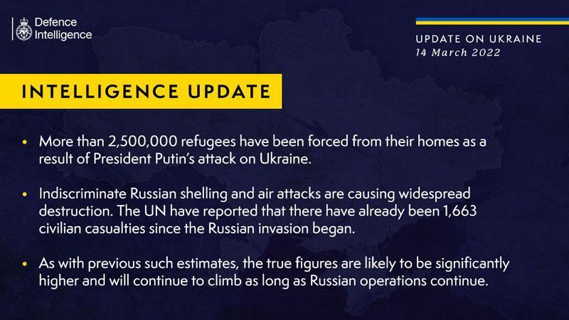 İngiltere Savunma Bakanlığı tarafından paylaşılan günlük istihbarat raporunda, Rusya Devlet Başkanı Vladimir Putin’in Ukrayna’ya saldırısı sonucunda 2 milyon 500 binden fazla kişinin evlerini terk etmek zorunda kaldığı belirtildi. Raporda, “Ayrım gözetmeyen Rus bombardımanı ve hava saldırıları yaygın yıkıma neden oluyor. Birleşmiş Milletler (BM), Rus işgalinin başlamasından bu yana halihazırda 1663 sivil kayıp olduğunu bildirdi. Daha önceki bu tür tahminlerde olduğu gibi, gerçek rakamların önemli ölçüde daha yüksek olması muhtemel ve Rus operasyonları devam ettiği sürece tırmanmaya devam edecek” ifadelerine yer verildi.