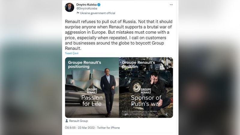 Ukrayna Dışişleri Bakanı Kuleba 23 Mart’ta twitter hesabından açıklama yaparak “Renault, Rusya'dan çekilmeyi reddediyor. Renault'nun Avrupa'da acımasız bir saldırganlık savaşını desteklemesi kimseyi şaşırtmamalı. Ancak hataların, özellikle tekrarlandığında, bir bedeli olmalıdır. Dünyanın dört bir yanındaki müşterileri ve işletmeleri Renault Grubunu boykot etmeye çağırıyorum” demişti.
