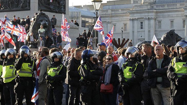 Açıklamada, yürüyüş güzergahından ayrılanların polis uyarılarını dikkate almadığı ve karşıt eylem gerçekleştiren ‘Stand Up To Racism’ (Irkçılığa Karşı Durun) grubunun bulunduğu alana gitmeye çalıştığı belirtildi. ‘Irkçılığa Karşı Durun’ grubunun alanına, ‘Krallığı Birleştirin’ eylemcilerinin girişini önlemeye çalışan polislerin saldırıya uğradığı ifade edilen açıklamada, polise çeşitli yabancı maddeler atıldığı ve bazı polislerin tekme ve yumruklarla hedef alındığı bildirildi.