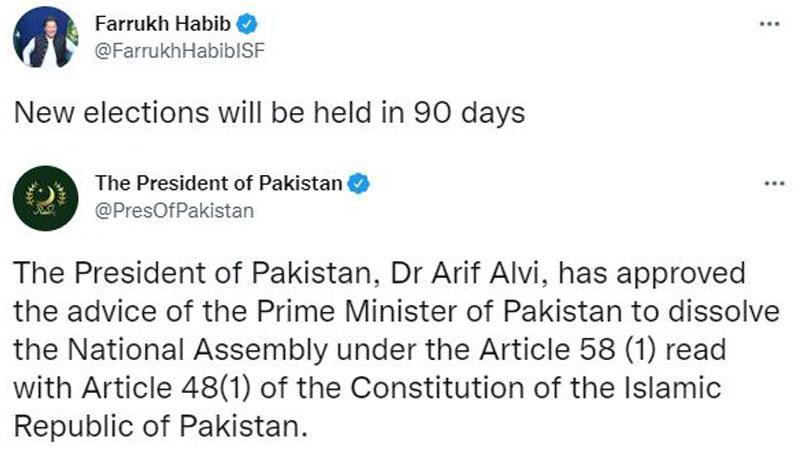 Pakistan Cumhurbaşkanlığı’ndan yapılan açıklamada, “Pakistan Cumhurbaşkanı Arif Alvi, Pakistan Başbakanı'nın Pakistan İslam Cumhuriyeti Anayasası'nın 48(1) maddesi ile birlikte okunan 58(1) maddesi uyarınca Ulusal Meclisi feshetme talebini onayladı. Cumhurbaşkanı Arif Alvi, Pakistan Anayasası'nın 101. maddesi uyarınca Mohammad Sarwar'ın Pencap Valiliği görevinden alınmasını onayladı ve Omar Sarfraz Cheema'yı Pencap Valisi olarak atadı” denildi.