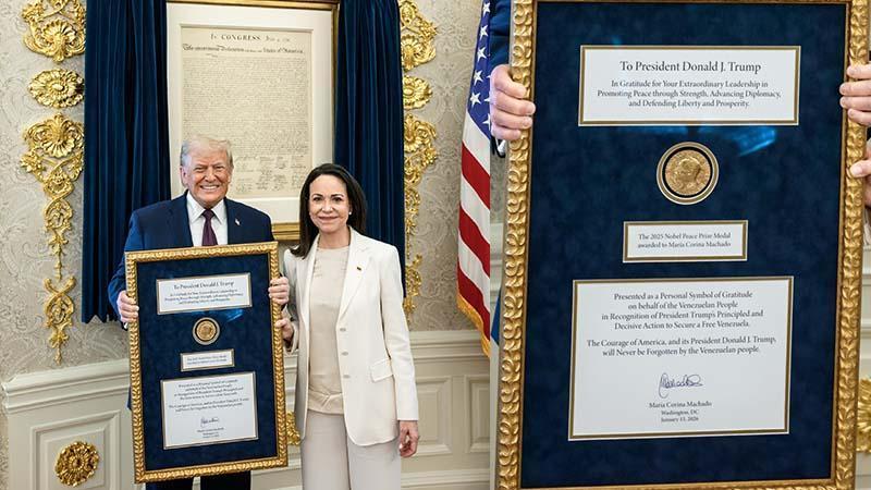 Görüşmede Machado, kendisine verilen 2025 Nobel Barış Ödülü'nü Trump'a takdim etti. Paylaşımında Machado’nun ödülünü kendisine sunmasından duyduğu memnuniyeti dile getiren Trump, “Maria, yaptığım çalışmalar için bana Nobel Barış Ödülü'nü takdim etti. Karşılıklı saygının ne kadar güzel bir göstergesi. Teşekkürler Maria” dedi.