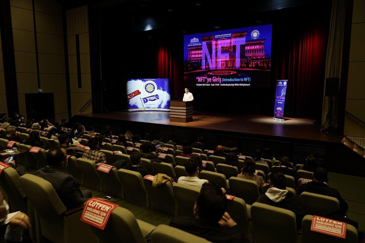 Türkiye’de ilk kez Ankara Üniversitesi’nde ve yüz yüze eğitimle başlayacak dijital bir içerik olan ‘NFT’ye Giriş’ (Introduction to NFT) dersinin ilki Cumhurbaşkanlığı Millet Kütüphanesi Konferans Salonu’nda gerçekleştirildi. Bu kapsamda düzenlenen açılış törenine, Ankara Üniversitesi Rektörü Prof. Dr. Necdet Ünüvar, Kültür Bakanlığı Bakan Yardımcısı Özgül Özkan Yavuz, Cumhurbaşkanlığı Dijital Dönüşüm Ofisi Başkanı Dr. Ali Taha Koç ve akademisyenler ile çok sayıda öğrenci katıldı. ‘NFT’ye Giriş’ dersinin ilkini Öğretim Görevlisi Buğra Ayan gerçekleştirdi.